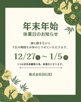 株式会社IBUKIより、年末年始の休業日についてお知らせです。